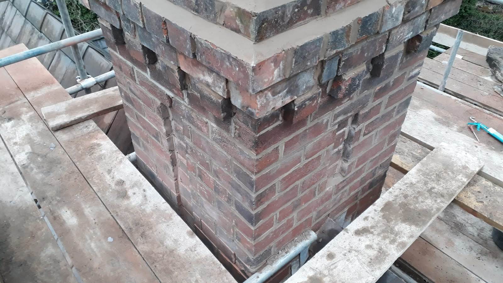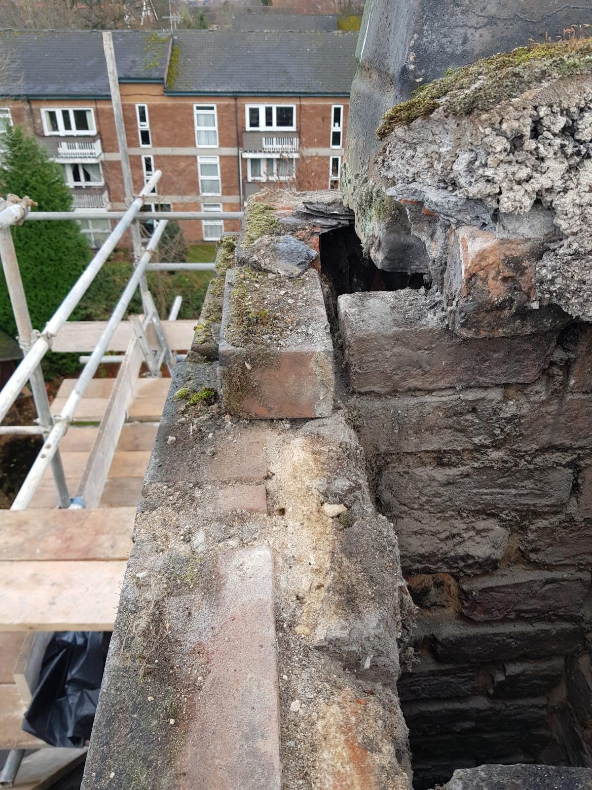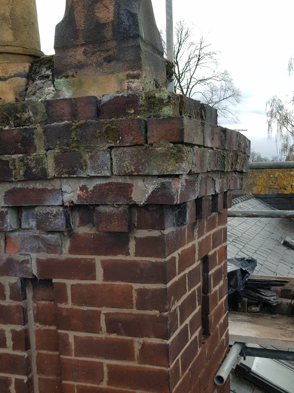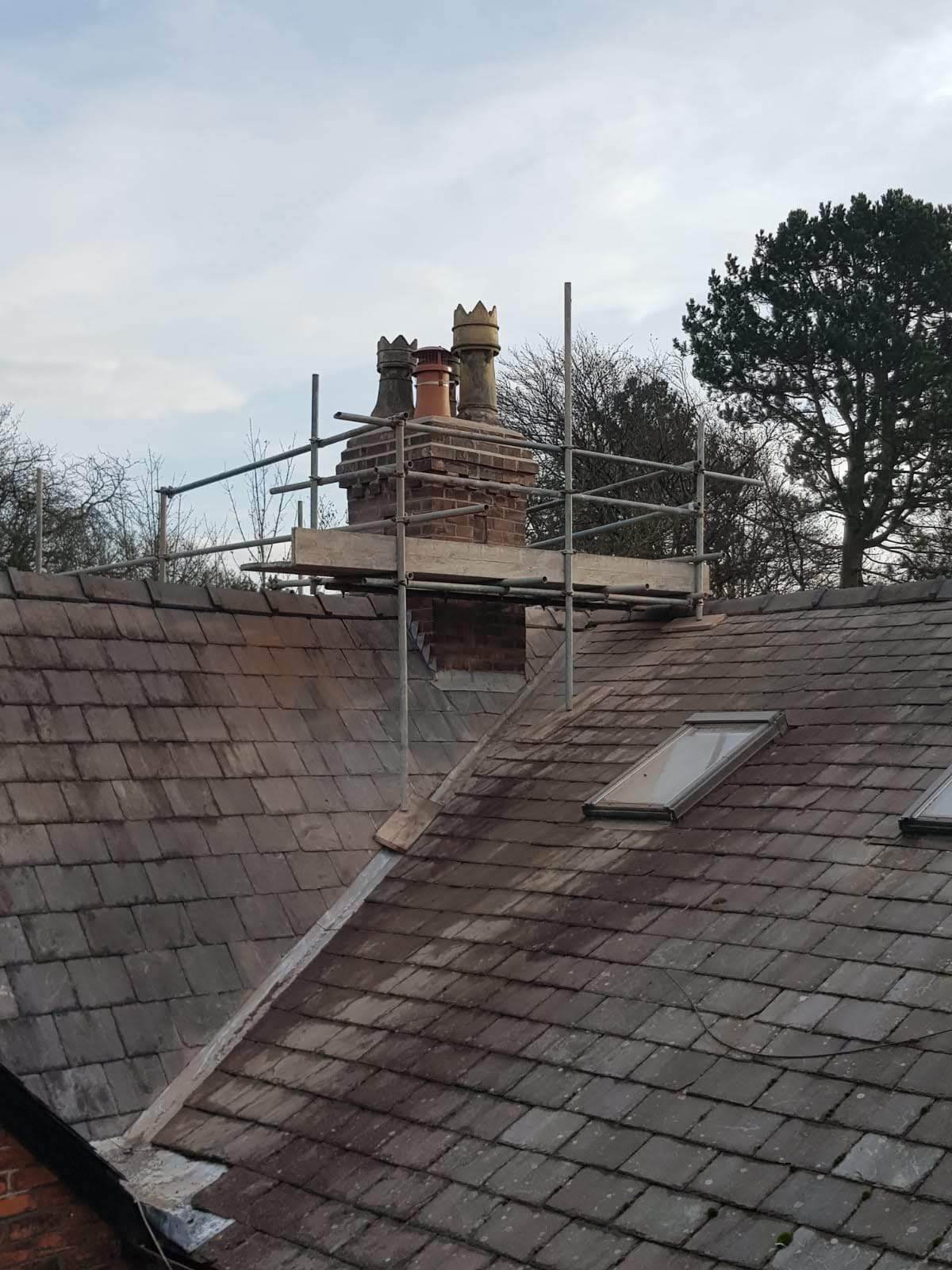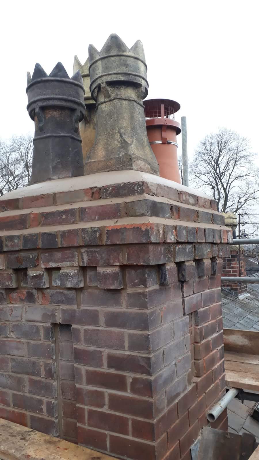Partial chimney rebuild using existing brick with old mortar ground out and re-pointed. Finished by resetting the pots and re-flaunching with correct rainwater fall. Job was in Cheadle: